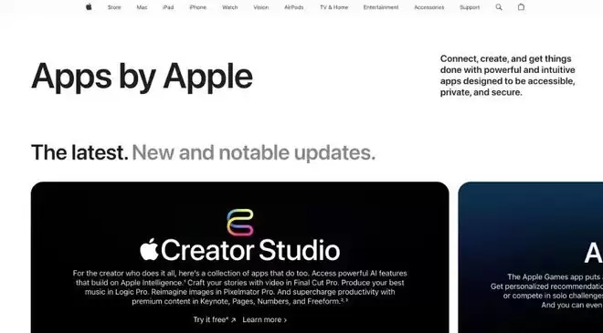 这三款软件,页面上不仅有每款软件的相关信息,还附有链接。如今的“Apple Apps”网页在“生产力”板块也提供了类似信息,同时加入了 Creator Studio 相关的推广内容。