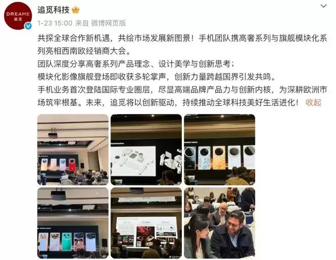 今年1月,追觅科技最新发文称,手机团队携高奢系列与旗舰模块化系列亮相西南欧经销商大会。