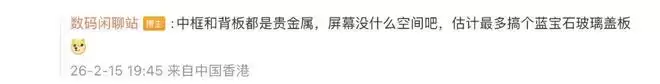 该博主还称,中框和背板都是贵金属,屏幕没什么空间吧,估计最多搞个蓝宝石玻璃盖板。