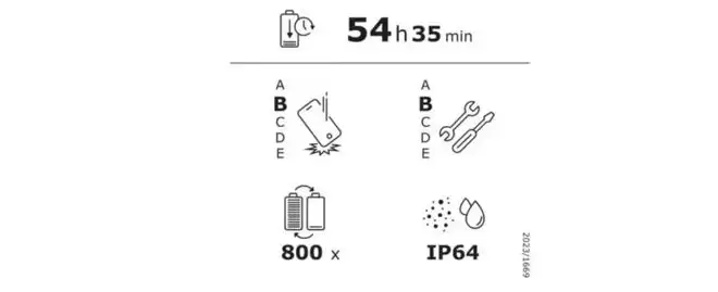 该机向欧盟申报的维修性等级和抗跌落等级均为 B 级,能效等级为 A 级,标称续航时间可达 54 小时 35 分钟。