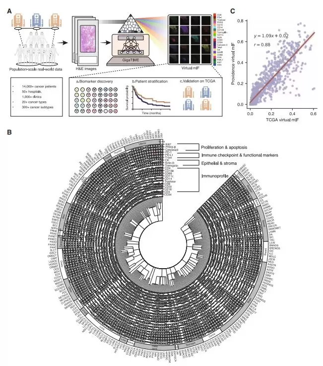 该研究不仅展示了从 H&E 生成 mIF 图片的可能性,更重要的是,基于虚拟图片实现了下游的临床发现:研究人员将 GigaTIME 应用于 1.4 万余名病人的 H&E 图像中,这些数据来自美国最大的医疗机构 Providence Health,共包括美国 7 个州、51 家医院和 1,000 多家诊所。