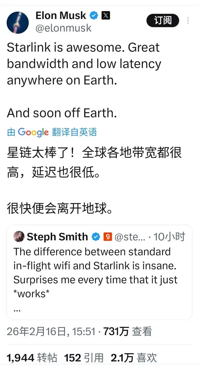 马斯克转发并回应称:“星链技术确实令人惊叹,无论你身处地球哪个角落,它都能提供超高速带宽和超低延迟,而且很快就能将服务范围扩展到地球之外。”