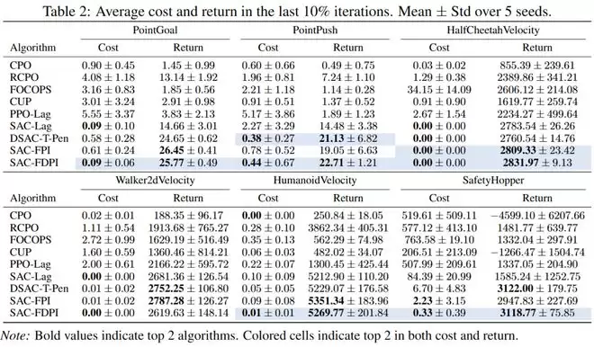 (1)安全性显著提升:RACS实现了最低的平均约束违反次数(Cost),显著优于现有的拉格朗日乘子法或信赖域方法。特别是在HalfCheetahVelocity、Walker2dVelocity等任务中,实现了严格的零约束违反。