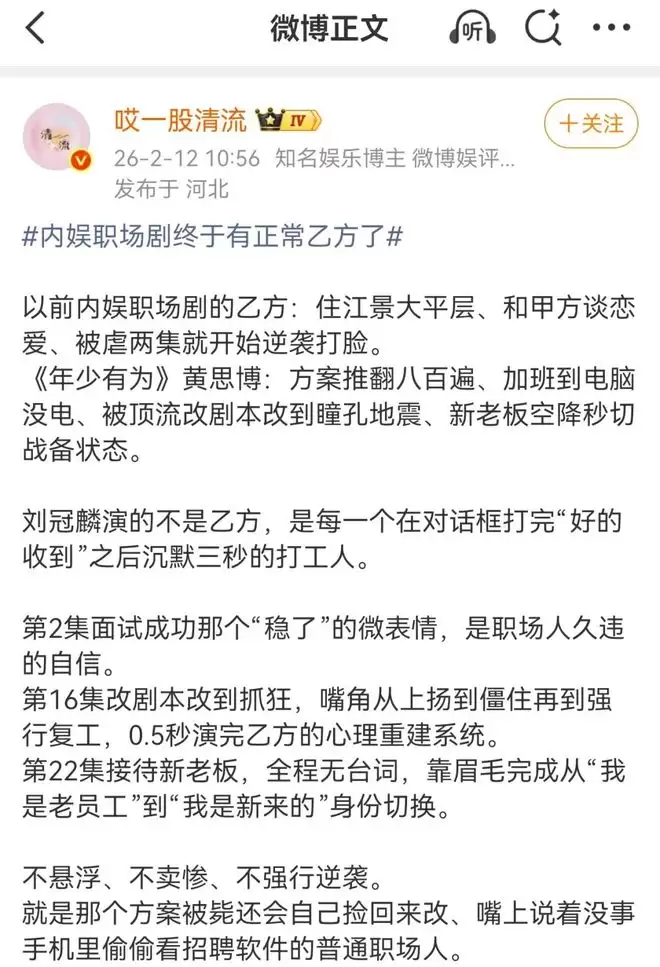 博主@ 哎一股清流追剧时在微博感慨,内娱职场终于有正常的乙方了,“不悬浮、不卖惨、不强行逆袭。”天选牛马黄思博努力的背后,其实映射了诸多乙方形象,做游戏要学会辨别五彩斑斓的黑,做影视需要拥有被修改到面部全非也脸不红心不跳的心态。