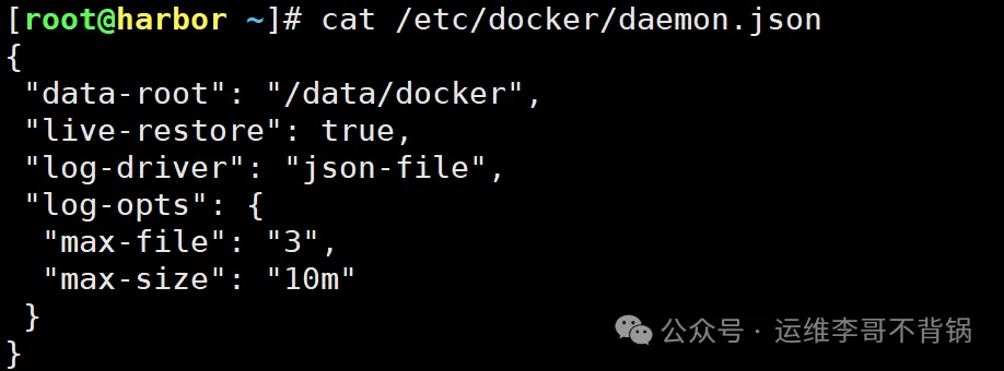 [root@harbor ~]# cat /etc/docker/daemon.json { “data-root”: “/data/docker”, “live-restore”: true, “log-driver”: “json-file”, “log-opts”: { “max-file”: “3”, “max-size”: “10m” }}