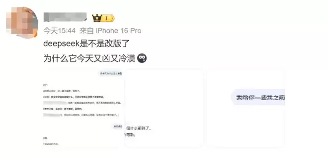 有网友表示DeepSeek“又凶又冷漠”,还有用户反映模型变得油滑了。