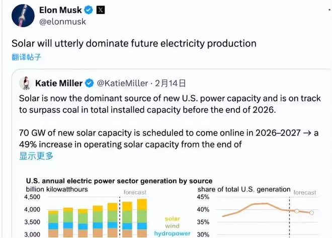 近日,马斯克在社交媒体上分享了自己的观点:“未来,太阳能将成为整个电力生产体系的主导力量。”他引用并评论的一篇文章提到,光伏已成为美国新增电力装机的主要来源,预计到2026年至2027年期间,新增装机容量将达到70吉瓦。