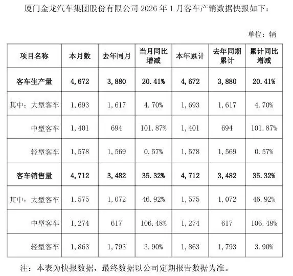 金龙汽车集团最新公布的销售数据表现不俗,在客车细分市场表现尤为抢眼。2026年1月,该集团大型客车销量达1,575辆,较去年同期增长46.92%;中型客车销量为1,274辆,同比增幅高达106.48%;轻型客车销量则为1,863辆,同比增长3.90%。三大车型全线实现正增长,其中中型客车的增速最为显著。