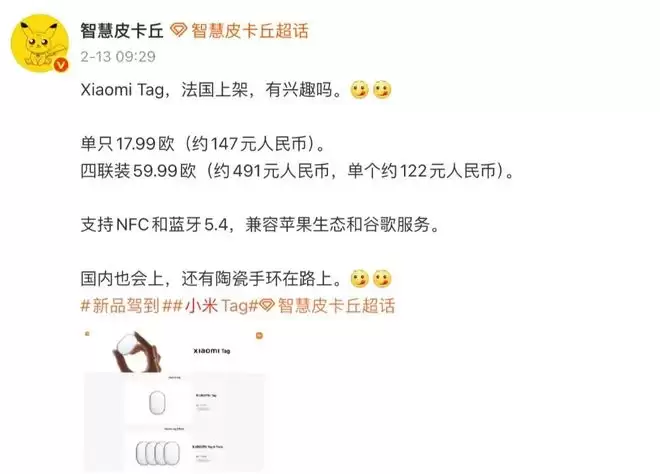 与此同时,博主@智慧皮卡丘 的爆料显示,“Xiaomi Tag,法国上架,有兴趣吗。单只17.99欧(约147元人民币)。四联装59.99欧(约491元人民币,单个约122元人民币)。支持NFC和蓝牙5.4,兼容苹果生态和谷歌服务。国内也会上,还有陶瓷手环在路上。”