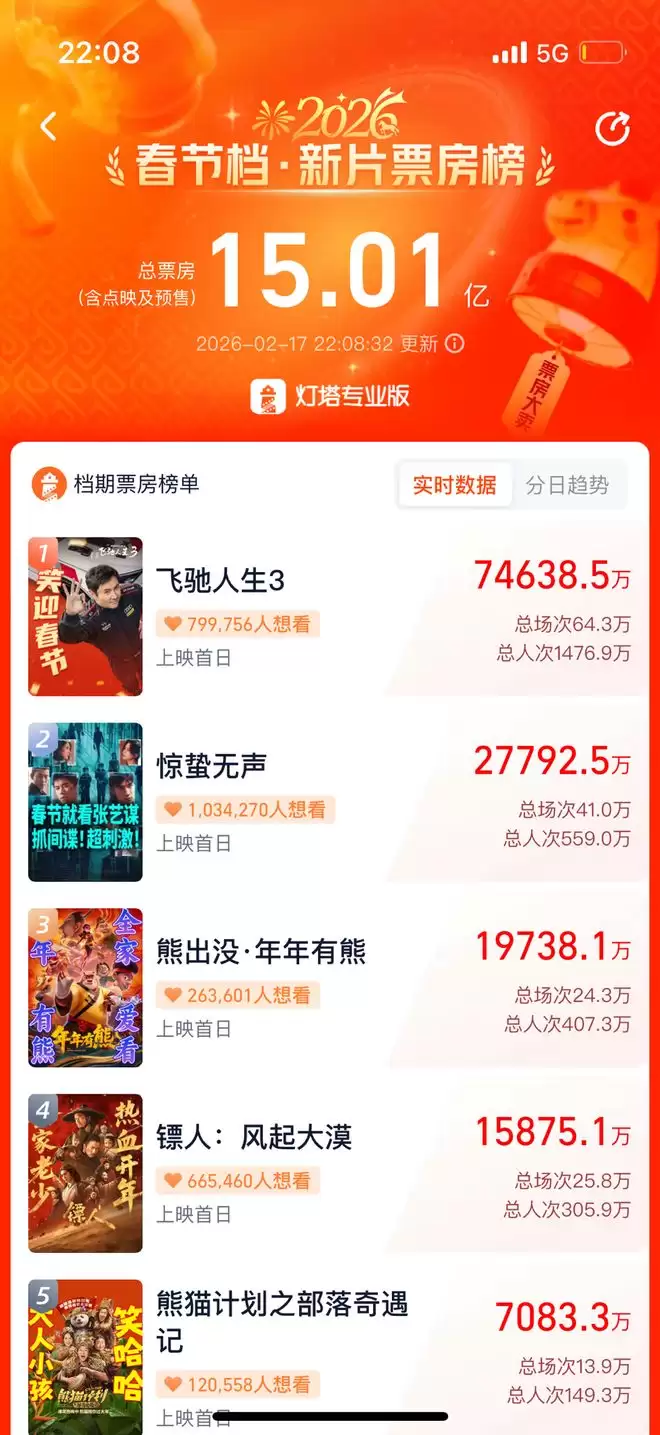 据大麦娱乐旗下灯塔专业版数据,截至2月17日21时,2026大年初一票房12.31亿元,到22时,春节档总票房已突破15亿元。仅《飞驰人生3》票房超6亿元,成为2026大年初一票房冠军。