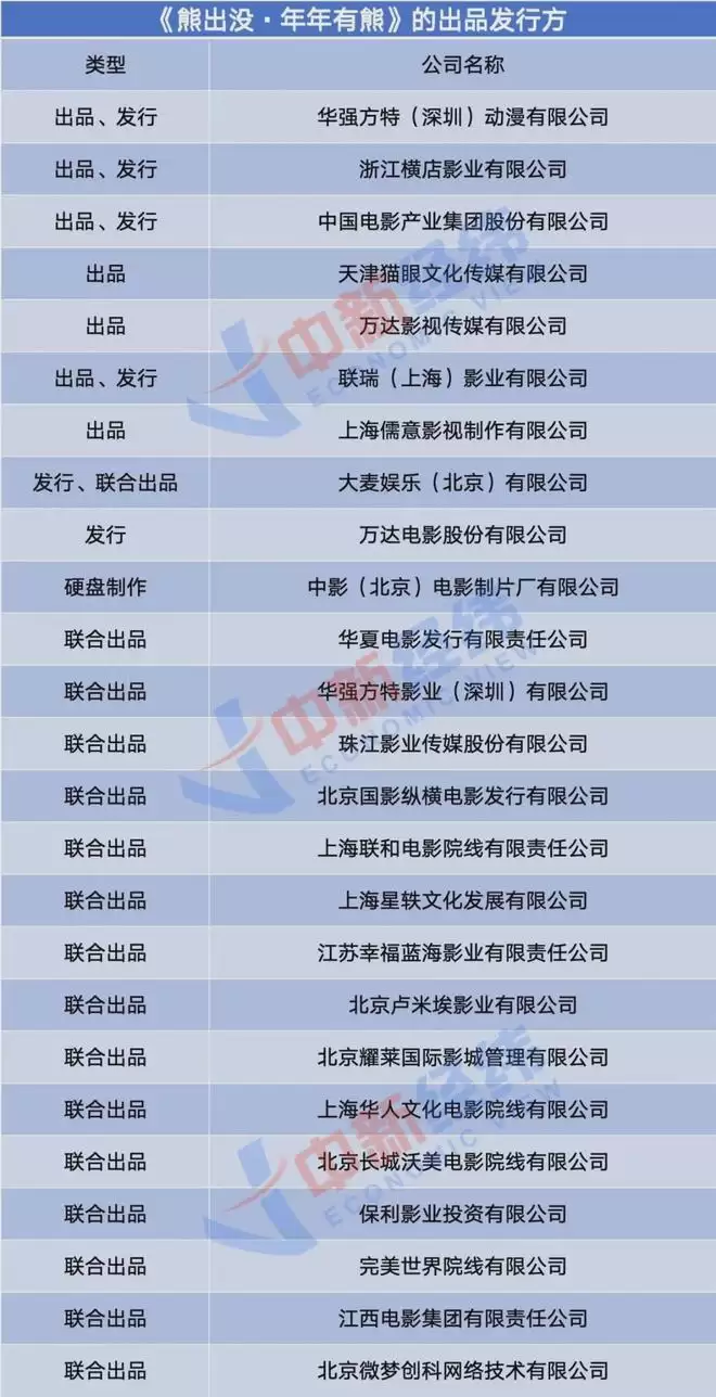 《熊出没·年年有熊》是第12部《熊出没》电影,该电影共有7家出品公司、6家发行公司、16家联合出品公司,除华强方特外,还能看到中国电影、横店影视、万达电影、幸福蓝海等上市公司的身影。