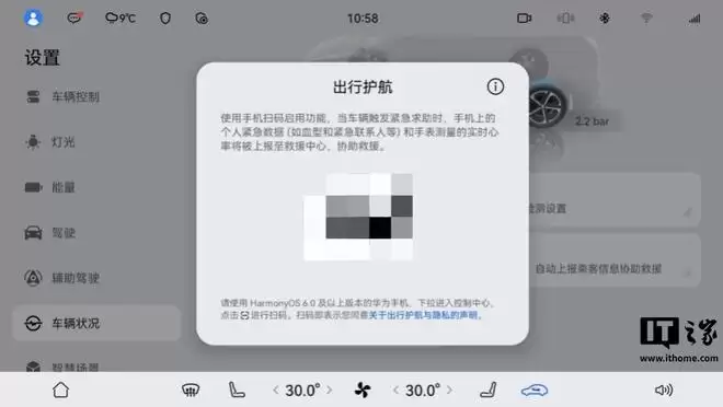 1、在车机设置 > 车辆状况 > 出行护航中,点击“出行护航”会弹出二维码绑定界面;2、在手机下拉控制中心,点击“扫一扫”扫描车机二维码,并依照引导完成授权绑定;3、在手机出行护航界面上点击“个人紧急信息”,填写相关个人医疗信息;4、若手机已与手表连接,且已授权心率数据同步,则无需再次设置。