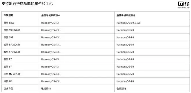 车型 最低车机系统版本 最低手机系统版本 尊界 S800 HarmonyOS 4.3 HarmonyOS 5.0.1.120 享界 S9 2026 款 HarmonyOS 4.3.1 HarmonyOS 6.0 享界 S9 HarmonyOS 4.3.1 HarmonyOS 6.0 智界 R7 2026 款 HarmonyOS 4.3.1 HarmonyOS 6.0 智界 S7 2026 款 HarmonyOS 4.3.1 HarmonyOS 6.0 智界 R7 HarmonyOS 4.3 HarmonyOS 6.0 智界 S7 HarmonyOS 4.3 HarmonyOS 6.0 问界 M7 2026 款 HarmonyOS 4.3.1 HarmonyOS 6.0 尚界 H5 HarmonyOS 4.3.1 HarmonyOS 6.0 更多车型敬请期待