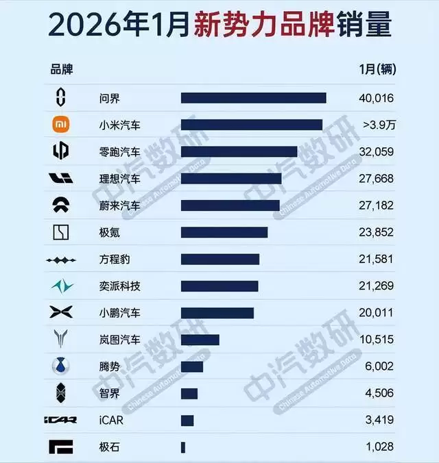 进入2026年1月,小米汽车继续保持强劲势头,以近4万辆的月销量位居新势力车企第二名。值得一提的是,由于小米SU7停产停售,这一销量几乎全部由小米YU7贡献。当月,小米YU7单款车型销量达到37869台,在所有车型中脱颖而出,不分油车、电车、增程式,也不分轿车、SUV、MPV等类别,一举成为全网销量第一的车型。