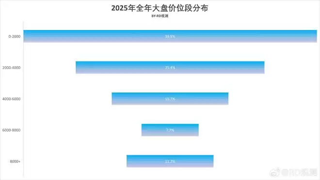 行业观察机构"RD观测"的数据表明,在过去的2025年,0-2000元价位区间的机型累计占比达到39.5%,稳居各价格区间首位。紧随其后的是2000-4000元价位段,整体份额为25.4%。排名第三的4000-6000元价位段,市场占比为15.4%。令人意外的是,8000元以上高端市场位列第四,整体份额达11.7%。这个超高端市场的占比甚至超过了6000-8000元区间,后者仅以7.7%的份额位居第五。若以4000元作为分界线,2025年国内4000元以下机型占比为64.9%,而4000元以上机型合计占比35.1%。由此可见,虽然国内高端市场看似增长迅猛,但实际上与中低端市场仍存在显著差距。