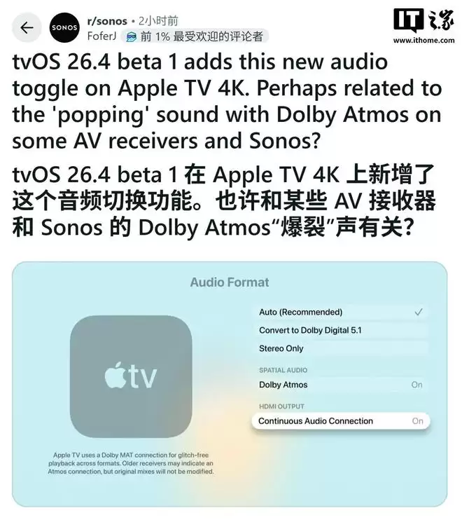 本次更新主要针对长期困扰高端音频用户的兼容性问题。此前大量使用Sonos音响系统搭配AV接收器的用户反映,通过Apple TV播放特定内容时,经常遭遇音频爆裂声或音量异常偏低的问题。
