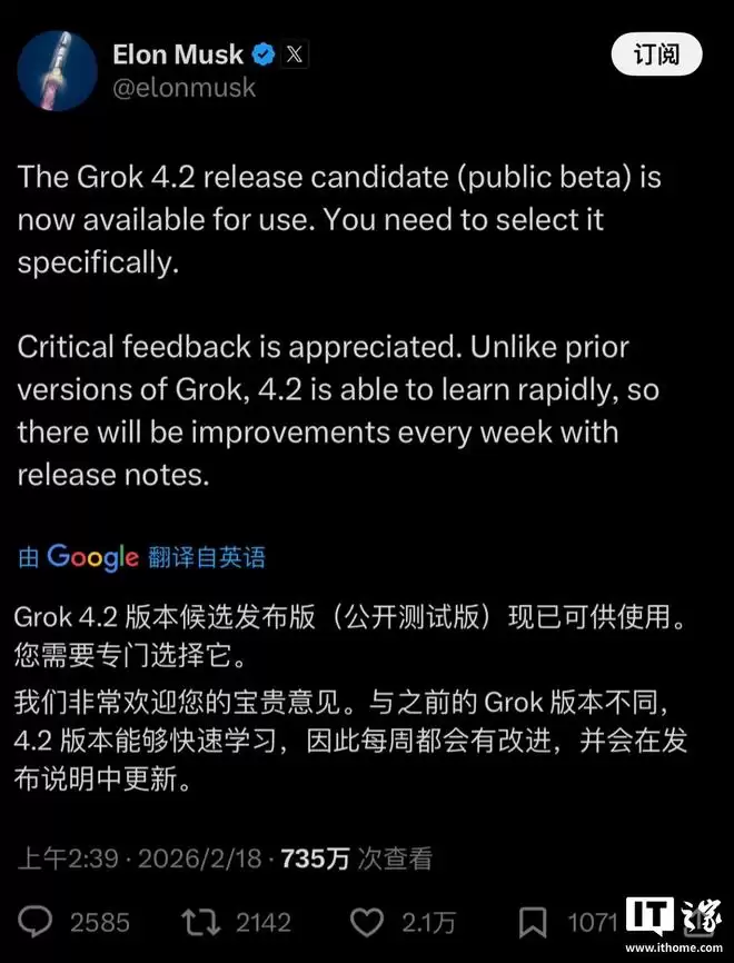 IT之家 2月18日快讯,特斯拉和X平台首席执行官埃隆·马斯克今日通过其社交平台X发文宣布,旗下人工智能公司xAI推出的大模型Grok迎来重要更新——4.2候选发布版(公开测试版)现已正式上线,面向用户开放使用。