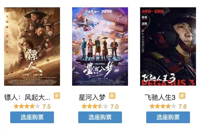 对观众而言,更值得关心的显然是真实观影后的客观口碑评价。在大年初一的热搜上,关于电影的讨论大多围绕口碑进行,比如,“飞驰人生3口碑两极分化”“星河入梦 黑马”。豆瓣评分首日有三部影片开分,分别是《飞驰人生3》的7.6分、《镖人:风起大漠》的7.5分和《星河入梦》的7.0分,三部均达到了7分以上,为2026年春节档维持住了平均水准。