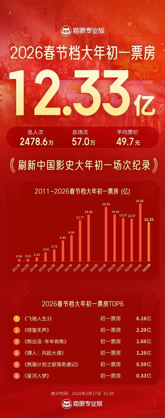 据猫眼专业版,2026年春节档首日票房12.33亿,同比下跌5.75亿,总人次2478.6万,同比下跌967.7万。唯一上升的数据只有总场次达到了57万,同比上升9万,刷新了中国影史大年初一场次纪录。