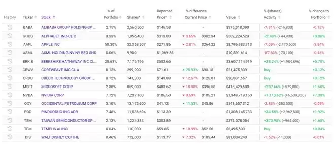 第四季度,苹果依然是其头号重仓股,持仓市值高达87.97亿美元,占比50.3%。然而,期间他减持了247.06万股苹果,减持幅度达7.09%。这一动作可能源于对单一标的持仓过重的风险控制,也可能是为了腾挪资金加码AI。