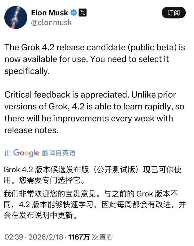 今天,特斯拉CEO埃隆·马斯克通过X平台正式宣布,由旗下xAI公司开发的大模型Grok 4.2候选发布版(公开测试版)现已开放使用。