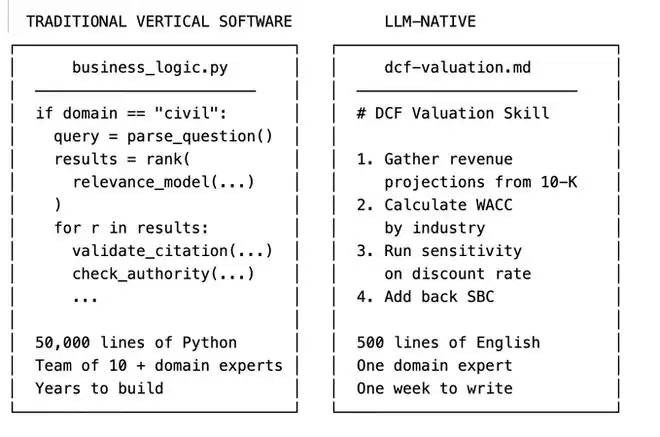 这是最颠覆的一点。以前要复刻一个法律或金融工作流,需要懂行业的工程师写几年代码;现在,一个懂行的基金经理只要写一个Markdown文档(提示词技能),告诉AI怎么做DCF估值,AI就能执行得很好。核心壁垒从“稀缺的工程师”变成了“廉价的文档”,竞争对手复制你的时间从几年缩短到了几周。