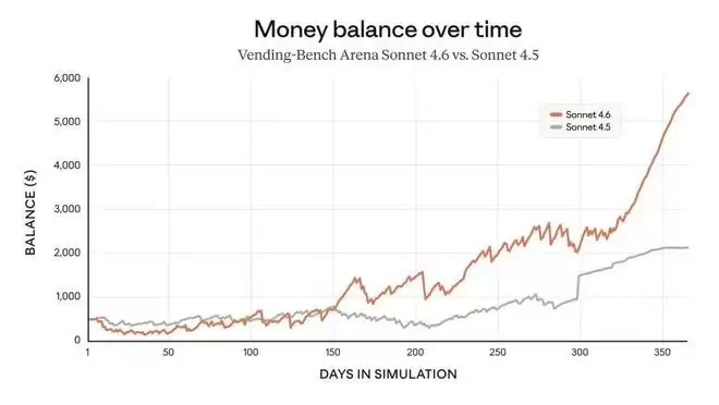 图表显示 Sonnet 4.6 在 Vending-Bench Arena 上优于 Sonnet 4.5:通过早期投资产能,然后在最后阶段转向盈利。