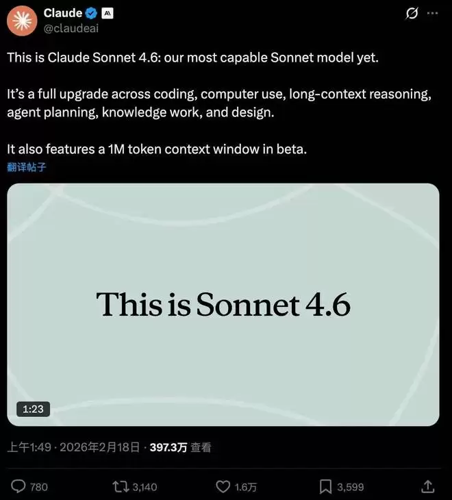 Claude Sonnet 4.6发布:百万token上下文带来更强AI体验