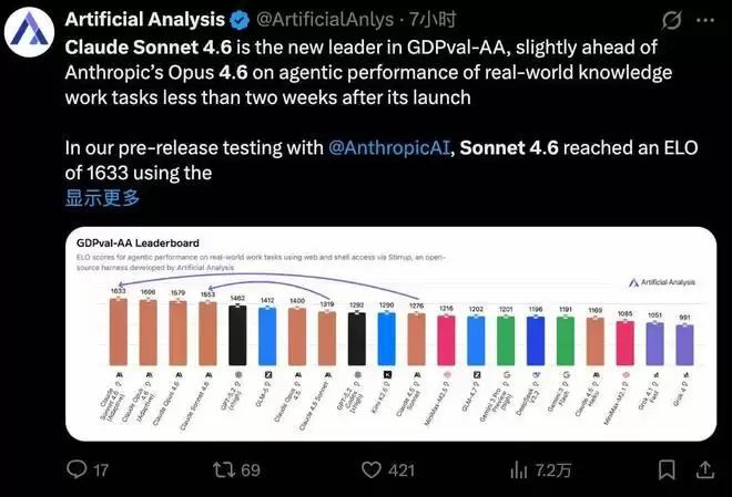 那么具体性如何?在 GDPval-AA 测试中,Claude Sonnet 4.6 甚至略微领先于 Anthropic 刚刚发布不久的 Opus 4.6。