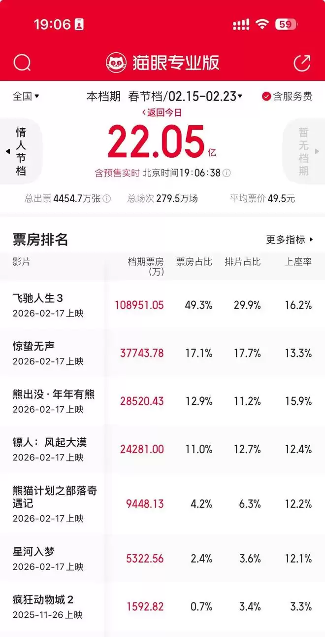 2026春节档票房破22亿,《飞驰人生3》10亿领跑夺冠