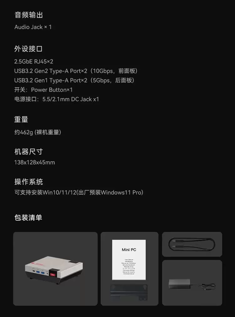 其他方面,这台迷你主机预装了Windows 11专业版操作系统,支持WiFi 7和蓝牙5.4连接,并支持多显示器输出。机身正面配备了一个USB4接口、两个USB-A接口以及一个3.5mm音频接口;背面则提供了双2.5G网口、HDMI 2.1、DP 2.0、USB 3.2 Gen 2 Type-C以及额外的USB 3.2-A接口,扩展性相当全面。