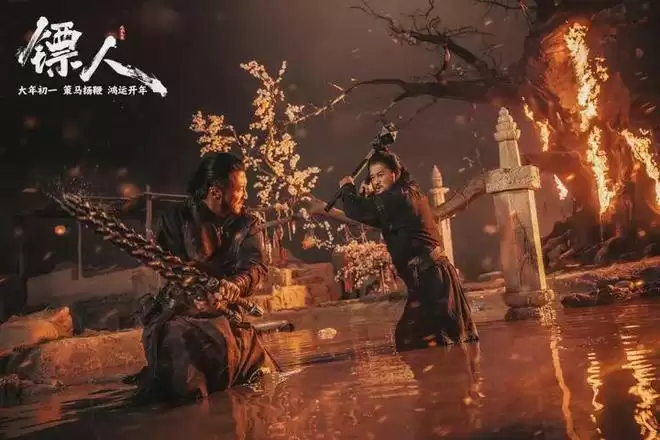 目前大家津津乐道的打斗戏有许多:比如在赤沙镇刀马和双蛇VS常贵人,李连杰可谓宝刀不老,与两位中生代打了一套扎实俊朗的传统武术;又比如在黑牛滩刀马VS竖,黑夜火油,红光剑影,丰富且危险的环境元素为这场兵器战增趣不少。