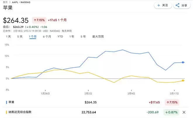 苹果恰好不符合上述任何焦虑情境。这家iPhone制造商既未参与资本支出狂潮,也没有被视为面临Anthropic PBC旗下Claude等工具威胁的主要业务线。2月苹果上涨1.7%,而纳指下跌3.2%,Magnificent Seven指数暴跌7.2%,后者正走向3月以来最差月度表现。