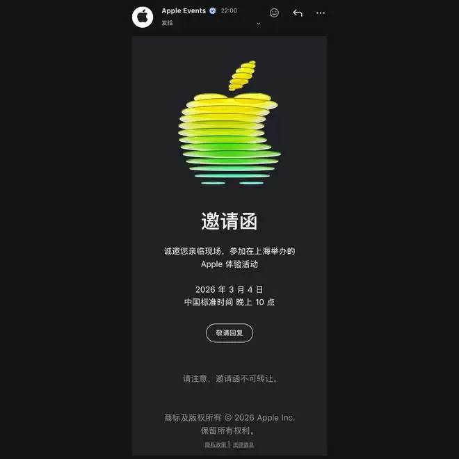 昨晚加班看春晚期间,爱范儿收到了来自苹果的邀请函,官宣将于 3 月 4 日晚 10 点举办 2026 年的首场发布会: