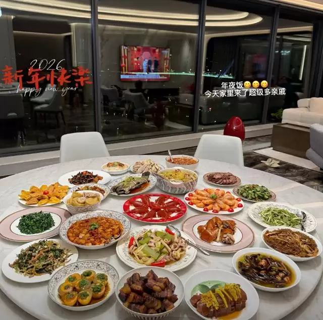 而在除夕夜当天在上海豪宅招待亲戚的宣云,她也是准备了满满一桌美味佳肴,只见客厅巨大的圆形大理石餐桌上摆放了红烧鱼,烤鸭,虾,炒菜,凉拌菜等,细数了一下有24道菜,每道菜色彩鲜艳,摆盘精致,既有传统年菜的影子,又融入了现代烹饪的精致,真的是超级丰盛。