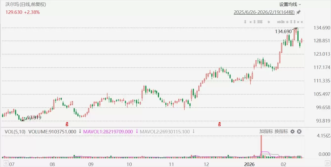沃尔玛(WMT.US)在2月19日盘初交易中上涨近3%,股价触及130.1美元。公司最新发布的业绩报告显示,第四季度营收达到1906.6亿美元,高于市场预期的1905.8亿美元。调整后每股收益为0.74美元,同样优于预期的0.73美元。