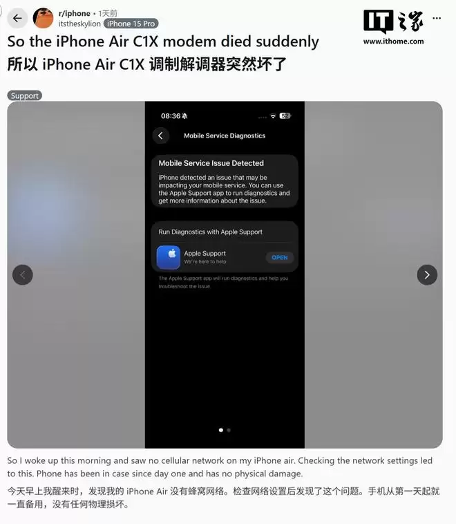 IT之家2月20日消息,一位名为itstheskylion的网友昨日(2月19日)在Reddit社区发帖,反映其iPhone Air在全程佩戴保护壳且无任何跌落史的情况下,蜂窝网络信号突然丢失。科技媒体Wccftech、MacRumors等报道称,这是全网首例iPhone Air基带故障。