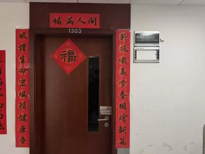 在周昌阳的办公室门外,研究组的小伙伴们贴上了福字和春联。上联写的是“科技织美梦基因绘新篇”,下联“破译生命密码编辑健康春”,横批“福满人间”。这大概就是科研人的春节缩影,科研工作与年俗交织在一起。而那个春节期间家家都有的“福”字,对周昌阳团队来说还有另一层意思,便是造福人类的“福”。