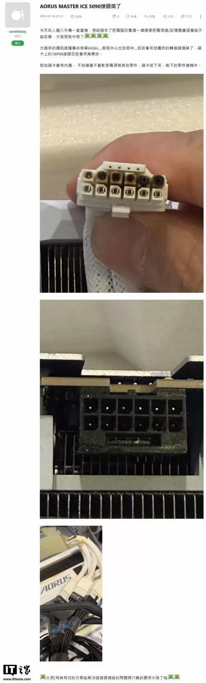 IT之家 2 月 20 日讯,网友 @sanetidaay 昨日(2 月 18 日)在 mobile01 论坛发帖,反映其技嘉 RTX 5090 AORUS Master ICE 显卡发生 12V-2x6 电源接口熔毁事故。