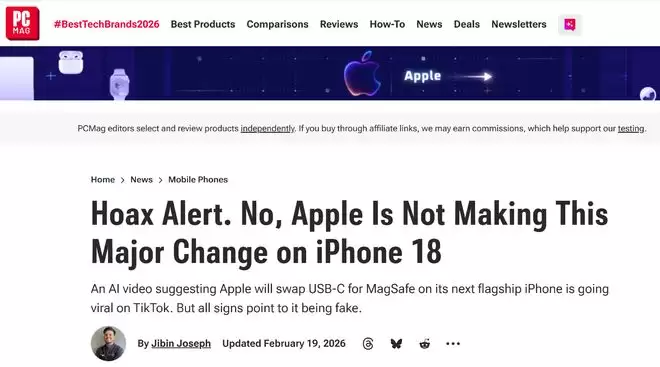 【环球网科技综合报道】2月20日消息,据外媒PCMag报道,近期有传言称苹果公司计划为iPhone 18 Pro机型配备磁吸充电接口,以此取代当前使用的USB-C接口。针对这一说法,海外媒体已明确予以驳斥,表示该传闻在现实中完全不成立,无论是从产品功能设计还是相关法规要求来看,苹果都不可能做出这一调整。