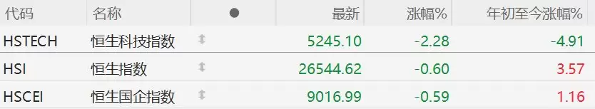 截至半日收盘,恒生科技指数下跌2.28%,恒指跌0.61%报26544.12点,国企指数跌0.59%;恒指大市成交额918亿港元。