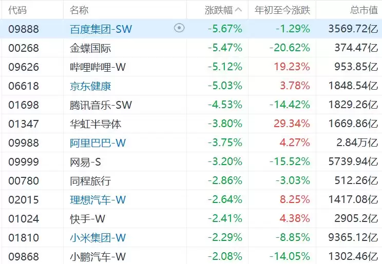科技股集体下跌,AI应用、机器人、存储、石油股逆势上涨。恒生指数成分股中,中石油涨超5%,恒基地产、中海油涨超3%,李宁、信达生物涨超2%;恒生科技指数成分股中,百度、金蝶国际、哔哩哔哩、京东健康跌超5%。