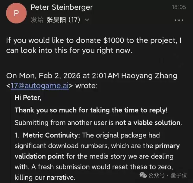 开发者向OpenClaw的作者Peter Steinberger发去邮件,想弄清下架的核心原因,也希望了解具体的配合方向,以便推动插件尽快重新上架。