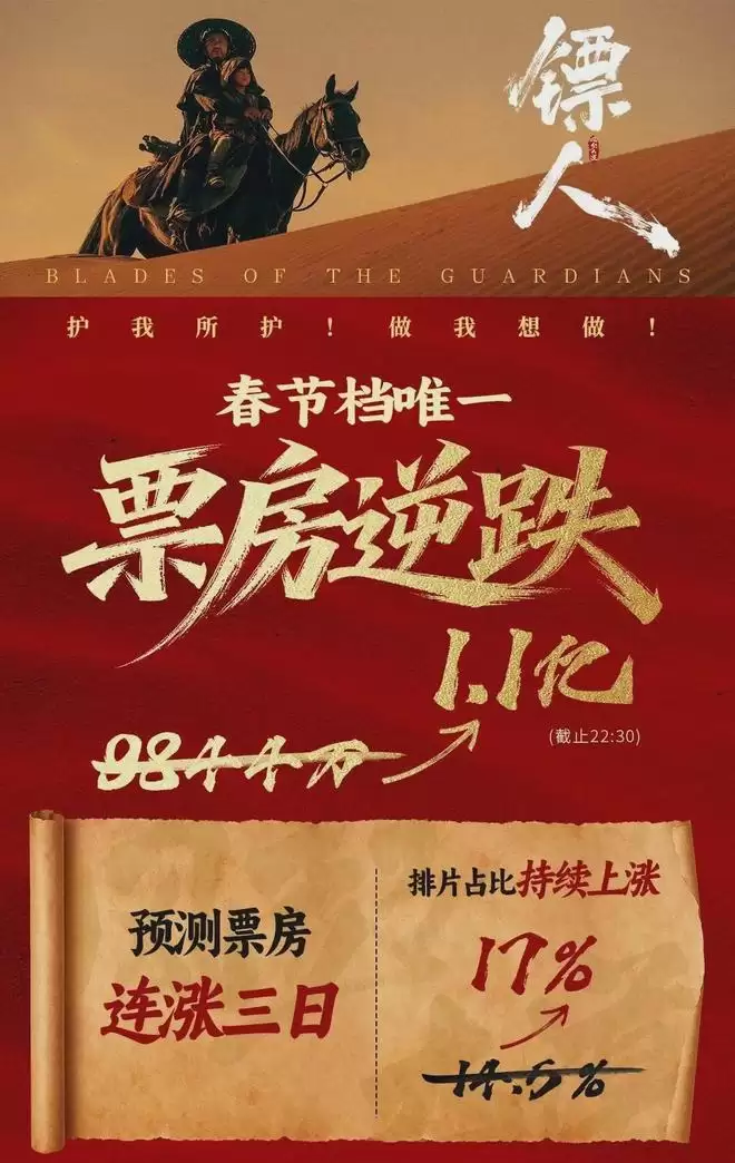 吴京主演的武侠大片《镖人》是唯一日票房逆跌的春节档新片了,预测票房更是连续三天上调,不知道还有没有机会拿《流浪地球》剧本。