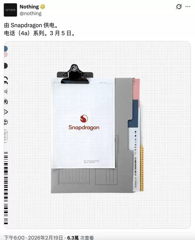 从官方发布的预热图片中,可以清晰看到一个印有高通骁龙标识的文件图标,这无疑是最直接的证据。Nothing在配文中同时透露,Phone(4a)系列新机预计将在3月5日正式与大家见面。