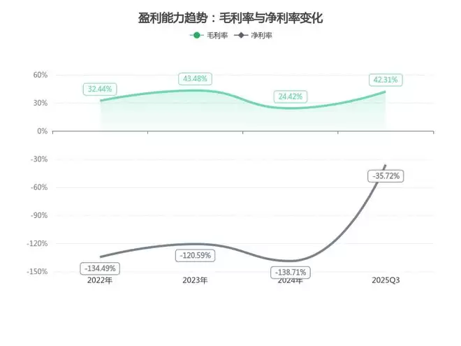 2025年Q3公司盈利质量显著改善,毛利率回升至42.31%,较2024年提升17.89个百分点;净利率为-35.72%,较2024年的-138.71%大幅优化,核心驱动因素如下。