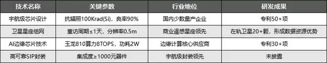 公司核心技术围绕宇航与AI两大主线构建,在宇航级芯片设计、卫星星座组网、AI边缘芯片等领域形成深厚技术壁垒,技术参数优于行业平均,且专利布局完善,具体技术优势如下: