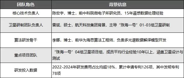 公司研发团队核心优势为“航天背景+跨领域技术融合+长期项目经验”,与商业遥感全链条布局战略高度适配,核心团队信息与研发投入如下: