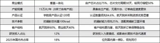国内市场中,航宇微作为垂直一体化厂商,在产能、产品认证、技术参数等方面占据明显优势,位列国内宇航级芯片第一梯队,与国内同行的核心对比如下: