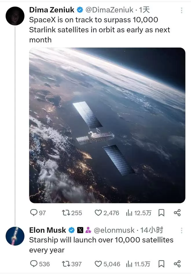 有网友在社交媒体X上透露:“SpaceX最快有望在下个月就让在轨的星链卫星总数突破一万颗大关。”马斯克对此回应称:“星舰每年将部署超过一万颗卫星。”